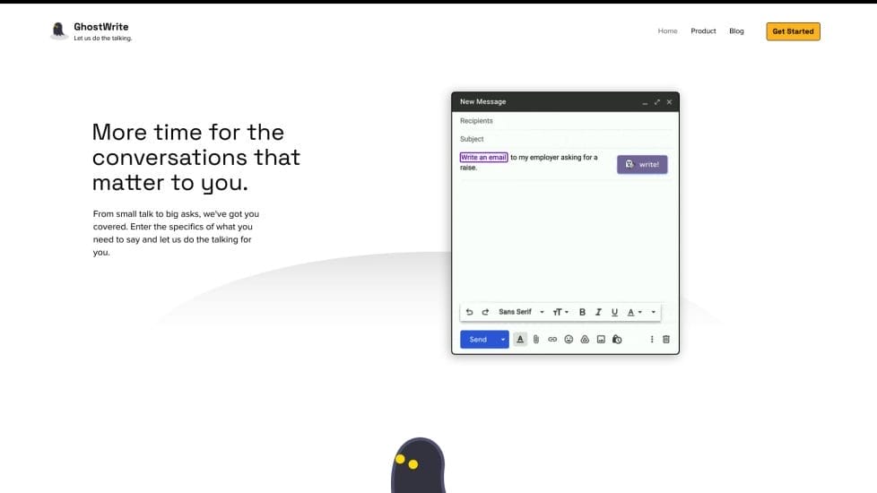 Ghostwrite è un assistente per la scrittura di email basato sull’intelligenza artificiale. Questo strumento automatizza la creazione di email, consentendo di inserire informazioni di base e lasciando che l’AI generi il testo dell’email per te. Con Ghostwrite, puoi velocizzare il processo di scrittura delle email, riducendo il tempo impiegato per formulare messaggi chiari e professionali.