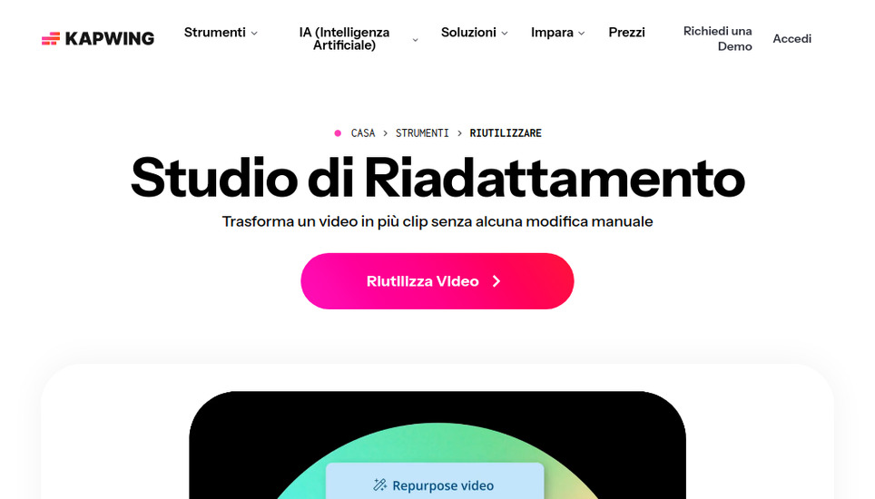 Kapwing offre strumenti AI per ritagliare video, generare sottotitoli automatici e adattare contenuti a formati verticali per Shorts, Reels e TikTok. La funzione repurpose aiuta a individuare clip e convertirle in pochi click.